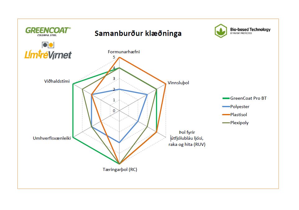 GreenCoat® er umhverfisvæn stálklæðning framleidd af SSAB fyrir sérstaklega krefjandi aðstæður. Klæðningin er varin af húð unnin úr sænskri repjuolíu og hefur gengið í gegnum áratugalangt þróunarferli til að tryggja sem bestu endingu.